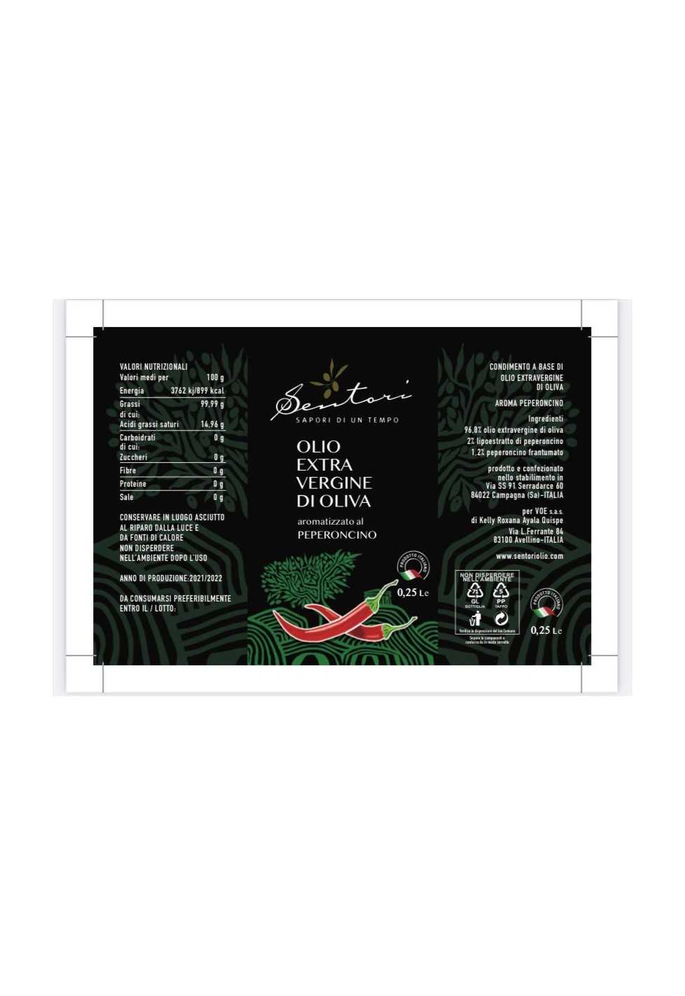 Olio extra vergine di oliva aromatizzato al peperoncino 100% italiano.