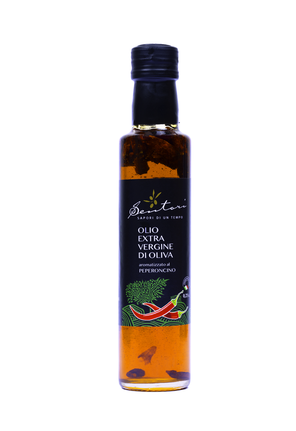 E' un olio che si presta bene a sperimentare piatti nuovi e ad impreziosirli con note piccanti. Sulla pasta, ovviamente, da il meglio di sè. E' con l'olio aromatizzato al peperoncino, conosciuto da molti anche come Olio Santo, che le due terre di Michele si incontrano. Di origini pugliesi e attualmente in Campania, Michele non poteva non includere tra le proposte di casa Sentori, l'Olio Extra Vergine di Oliva aromatizzato al peperoncino. Dagli spaghetti all'assassina in Puglia, alla pasta allo scarpariello di Napoli, l'intento di quest'olio è quello di farvi vivere l'esperienze culinarie che hanno caratterizzato l'infanzia di Michele e che caratterizzano ora il suo presente.